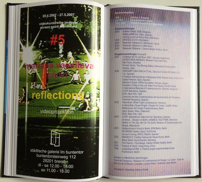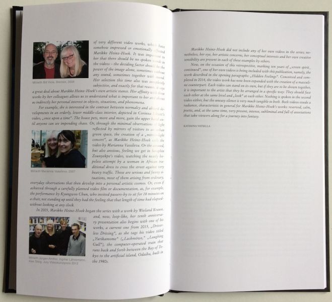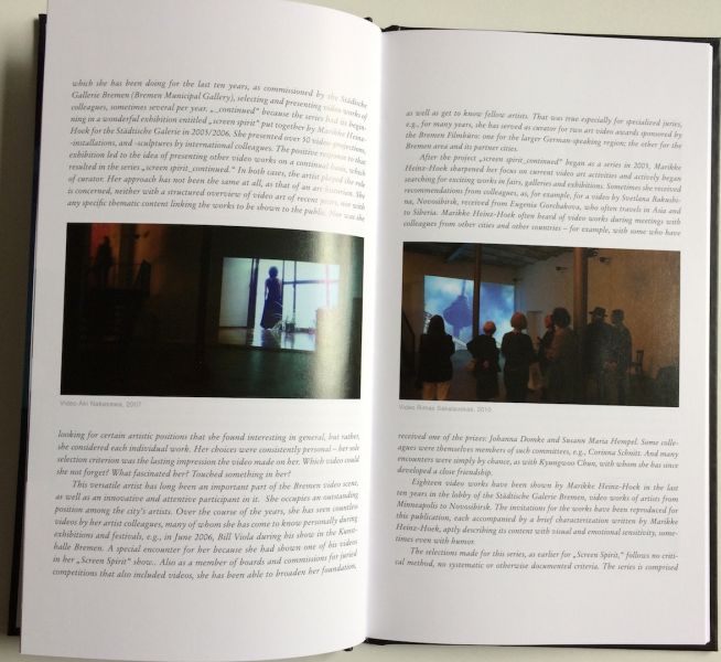 Seit 2005 zeigt die Künstlerin Marikke Heinz-Hoek in der Städtischen Galerie Bremen regelmäßig, in einer lockeren Reihenfolge, Videoarbeiten von Kolleginnen und Kollegen aus der ganzen Welt. „Screen spirit_continued“ ist der Titel dieser Reihe, anknüpfend an eine von ihr kuratierten Ausstellung im Jahr 2004 am selben Ort, mit dem Titel „Screen spirit“. Als Kuratorin hat die Künstlerin, die mit Malerei, Zeichnung, Objekten, Fotografie und Video arbeitet, einen besonderen Blick, der, anders als derjenige etwa einer Kunsthistorikerin, nicht einem Thema oder einer strukturierten Darstellung von Videokunst der letzten Jahre folgt. Sondern ganz subjektiv Videoarbeiten auswählt, die sie im Laufe der Jahre beeindruckten und in Erinnerung geblieben sind. Was wiederum auf Marikke Heinz-Hoeks eigene Arbeitsweise schließen lässt. Da sie in dieser Videoreihe mit keiner eigenen Arbeit beteiligt gewesen ist, wird nun in dieser Publikation auch eine Arbeit von ihr besprochen und gezeigt – dem Katalog ist eine DVD mit einem Video von 2015 beigefügt.
