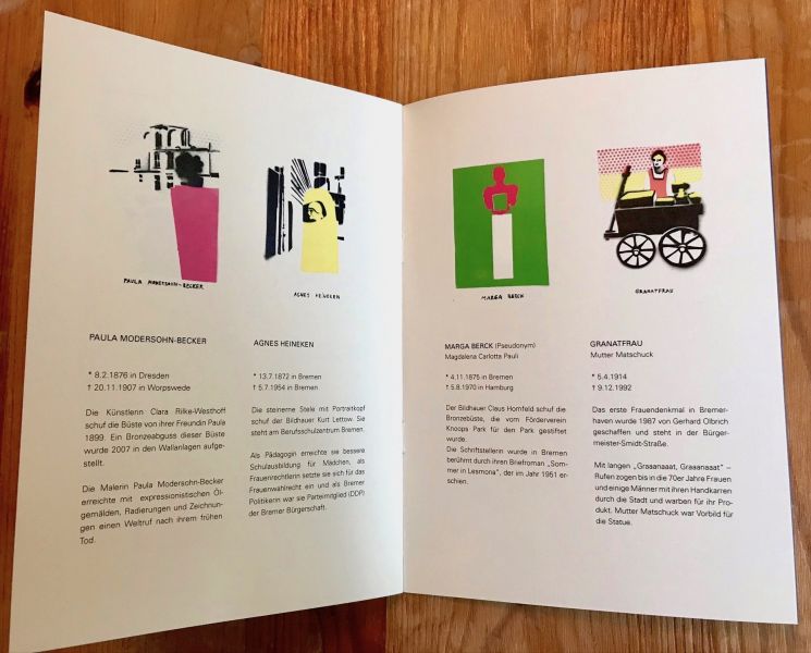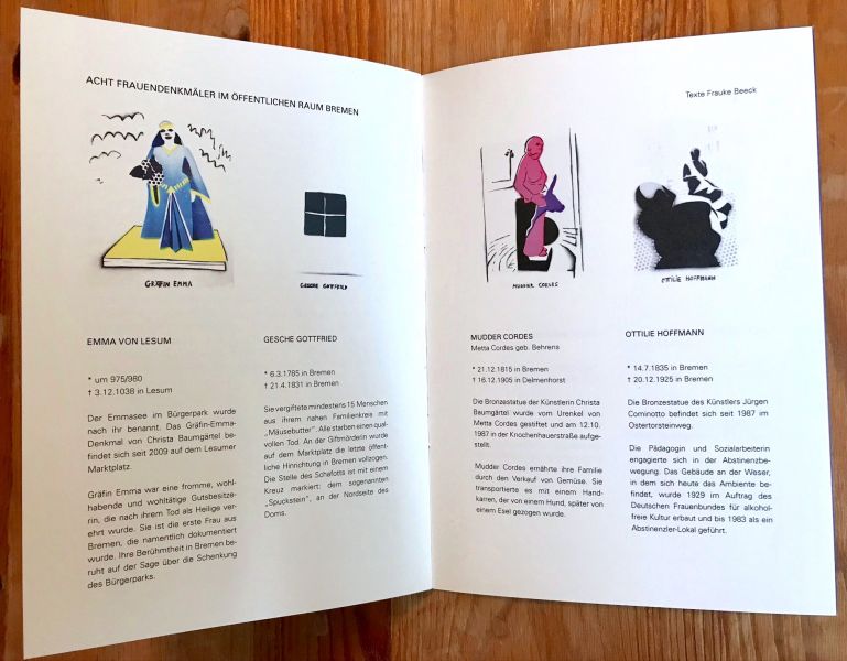 Diese Publikation ist anlässlich der Ausstellung "Frauensleute" in der Bremischen Zentralstelle für die Verwirklichung der Gleichberechtigung der Frau (ZGF) entstanden, in Kooperation mit dem Bremer Frauenmuseum e.V. Ausgangspunkt für die Werke in der Ausstellung waren für Frauke Beeck die acht bestehenden historischen Frauenstatuen im öffentlichen Raum Bremens. Die Künstlerin läßt in ihren Werken die Leistungen und persönlichen Geschichten dieser Frauen, die oft zu wenig bekannt sind, anklingen, ohne sie zu illustrieren. So stehen etwa übergroße Arbeiterinnenhände für „Mudder Cordes“, Kleidung als Statussymbol für die „Gräfin Emma“, das Arbeitsumfeld für die „Granatfrau" oder das soziale Engagement von Ottilie Hoffmann oder Agnes Heineken im Blick der Künstlerin. Als künstlerisches Projekt angedacht, bildet diese Publikation auch eine erste Dokumentation der historischen Statuen von Frauen in Bremens öffentlichem Raum.